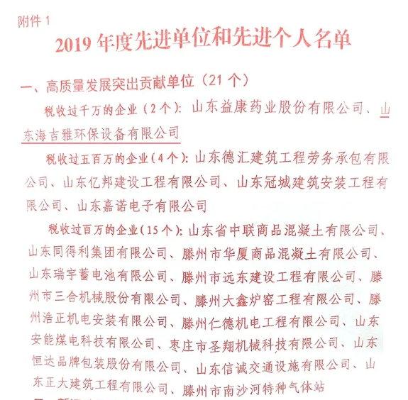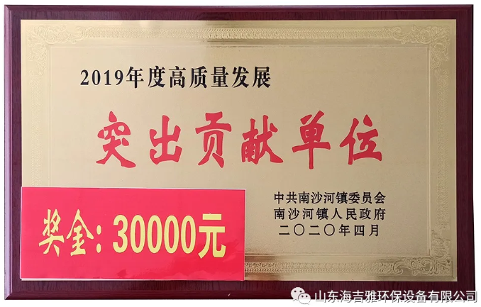 2019年度海吉雅環(huán)保實現(xiàn)稅收一千五百余萬元為南沙河鎮(zhèn)經(jīng)濟(jì)發(fā)展做出了重要貢獻(xiàn),榮獲“高質(zhì)量發(fā)展突出貢獻(xiàn)單位”稱號。