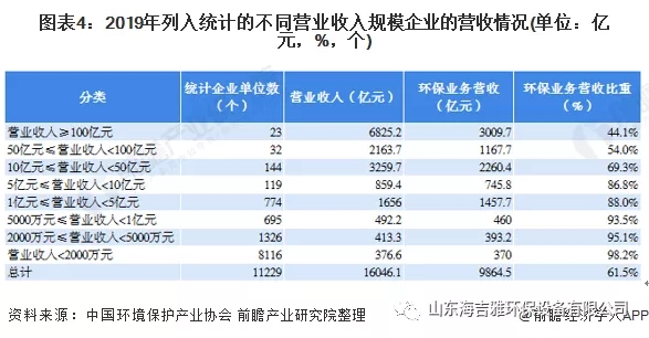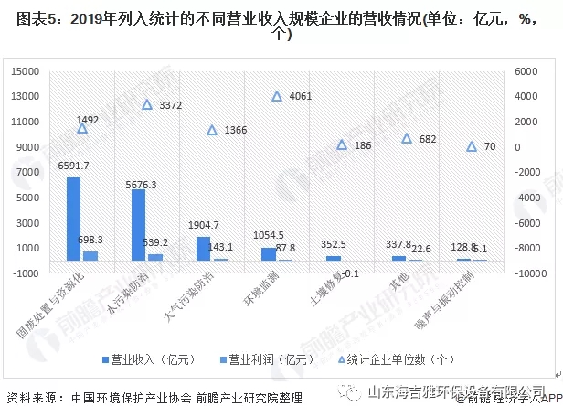 據(jù)我國環(huán)境保護(hù)產(chǎn)業(yè)協(xié)會統(tǒng)計(jì)數(shù)據(jù),2019年1492家固廢處置與資源化企業(yè)實(shí)現(xiàn)營業(yè)收入6591.7億元,實(shí)現(xiàn)營業(yè)利潤598.3億元;3372家水污染防治企業(yè)實(shí)現(xiàn)營業(yè)收入5676.3億元,實(shí)現(xiàn)營業(yè)利潤539.2億元;1366家大氣污染防治企業(yè)實(shí)現(xiàn)營業(yè)收入1904.7億元,實(shí)現(xiàn)營業(yè)利潤143.1億元。