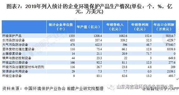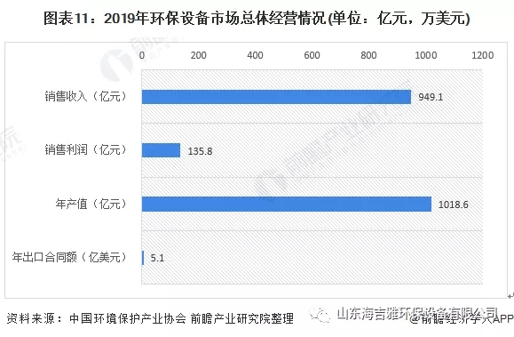 在《2020環(huán)保產(chǎn)業(yè)發(fā)展?fàn)顩r報(bào)告》中,2019年納入統(tǒng)計(jì)的環(huán)保設(shè)備市場共有1583家企業(yè);年產(chǎn)值為1018.60億元,銷售收入和銷售利潤分別為949.10億元和135.80億元,實(shí)現(xiàn)出口合同額51245.60萬美元。