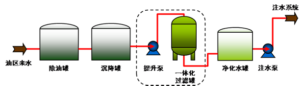 運行流程:油區(qū)來水→除油罐→沉降罐→一體化過濾罐→凈化水罐→喂水泵→注水泵;