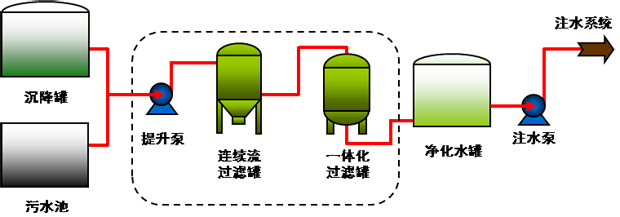運行流程:沉降罐/三相分離器/污水池→預(yù)處理罐→連續(xù)流過濾罐→一體化過濾罐→凈化水罐→喂水泵→注水泵