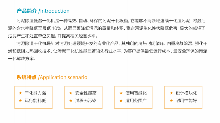 污泥除濕干化機是針對污泥處理領域開發(fā)的專業(yè)化產(chǎn)品。其獨創(chuàng)的冷熱封閉循環(huán)、四重冷凝除濕、強化干燥和低阻力熱回收技術,讓污泥干化機性能顯著領先行業(yè)水平,為客戶提供最低運行成本、最安全環(huán)保的污泥干化解決方案。