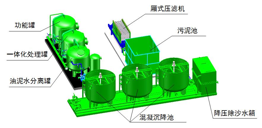 4.設(shè)備模塊化組裝,可以根據(jù)不同處理要求,合理調(diào)用,設(shè)備可處理鉆井液,壓裂、酸化等措施廢液,也可處理站內(nèi)的污水池污水,可以根據(jù)客戶需要最大限度發(fā)揮設(shè)備效能。